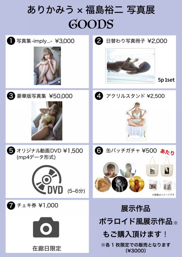 ありかみう展×福島裕二写真展 -imply…- 会場で販売いたしますグッズラインナップです。グッズサンプルを常設しておりますので、自由にご覧いただけます。また展示作品の購入もできます。グッズ購入金額に応じて、サインやオリジナルグッズがもらえる特典やモデルさんとのお話会に参加できる特典もございますので、この機会にぜひお求めください!